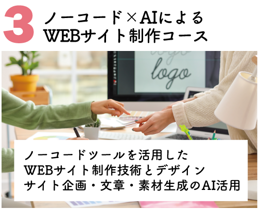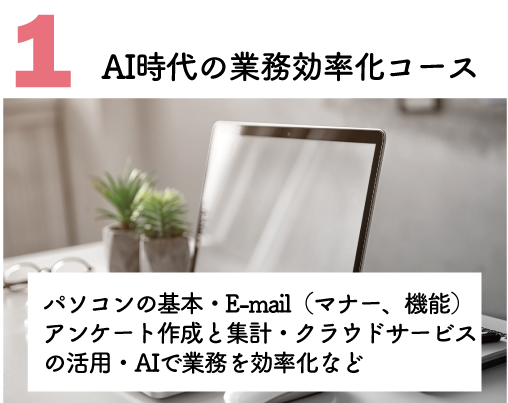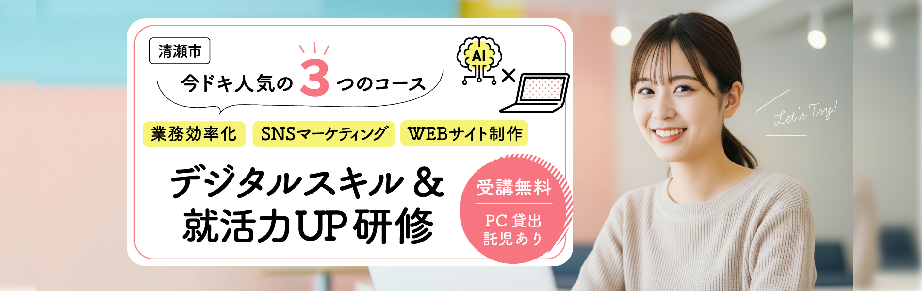 一般的なPC事務から、SNSマーケティング、WEBサイト制作まで、人気のコースが選べる充実講座です。