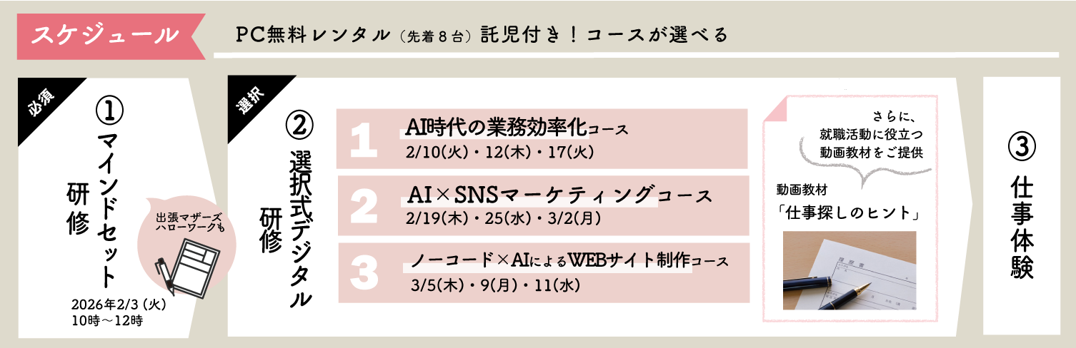 - 受講料・PCレンタル(先着8台)・託児はすべて無料です。ただし、配信を視聴するための通信料は、各自でご負担いただきます